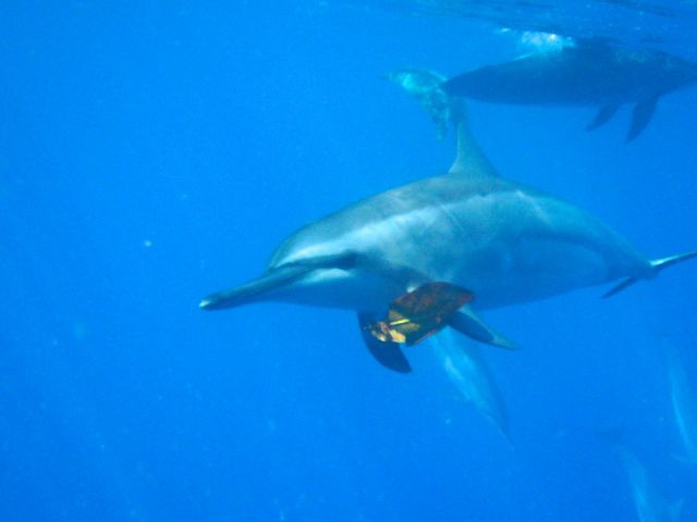 *リーフゲームとは、イルカが口やヒレに葉っぱを引っ掛けて泳いで、他のイルカや人とトスし合う遊びのこと。